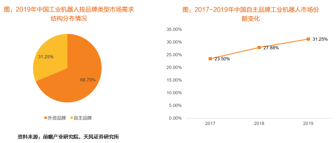 受到技术和人才因素影响,当前中国的机器人市场依旧由外资品牌占主导地位,但是中国自主品牌工业机器人市场份额逐步提升,并逐步出现国产替代的趋势。