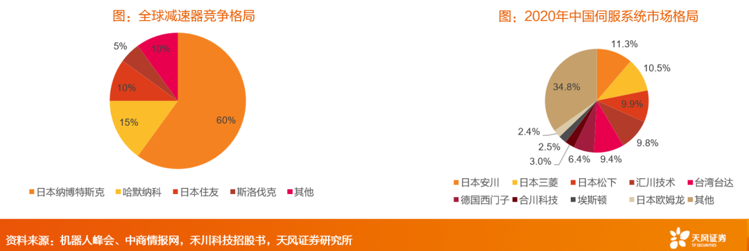 谐波减速器方面:竞争格局相对稳定,在机器人用谐波减速器领域,哈默纳科全球市场占有率超过80%,目前国内谐波减速器龙头企业绿的谐波开始国产替代,在自主品牌机器人方面渗透率超60%,为国产第一品牌,目前全球市场份额仅次于哈默纳科。
