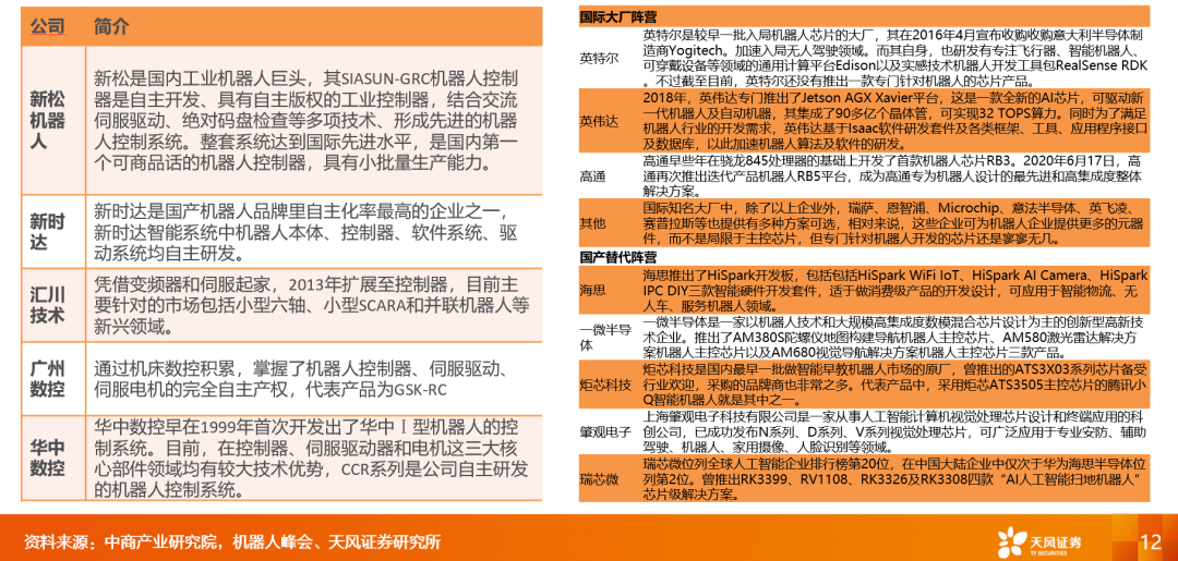 芯片龙头入局机器人动作频频,本土品牌加速布局国产替代:目前可用于机器人的芯片方案很多,高端产品还是以国际品牌为主,但本土品牌已在加速布局国产替代,尤其在AI芯片领域发展最快。另外,自主芯片对制程工艺的要求不高,中芯国际、华虹集团、华润微电子等本土晶圆制造商都可以满足生产需求,因此受限还比较小。
