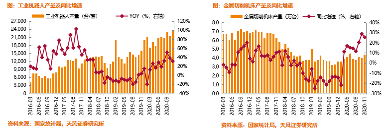 通用自动化持续升温,工业机器人月产量创新高:11月制造业生产稳步提升,高技术制造业与装备制造业表现突出;工业企业利润累计增速转正+出口强劲,支撑2021年制造业投资进一步恢复;中游自动化持续升温,11月工业机器人产量创新高。工程机械:2021年需求增长平稳,淡化板块β,聚焦龙头α。光伏设备:技术迭代带动光伏设备更新换代,异质结有望成为下一代主流技术。核心组合:三一重工、恒立液压、艾迪精密、浙江鼎力、春风动力、捷佳伟创、先导智能、国茂股份、中密控股、柏楚电子,关注迈为股份重点组合:建设机械、中联重科、杰克股份、佳士科技、杰瑞股份、弘亚数控、拓斯达、至纯科技、美亚光电、克来机电、星云股份本周专题:通用自动化持续升温,工业机器人月产量创新高11月制造业生产稳步提升,高技术制造业与装备制造业表现突出。11月制造业工业增加值同比增长7.7%,增速为2019年4月份以来最高。结构上:1)高技术制造业增加值同比+10.8%,增速年内新高;2)装备制造业增加值同比+11.4%,连续5个月保持两位数增长;3)电子行业增长9.3%,较上月回升4.3pct,拉动全部规上工业增速加快0.4pct。工业企业利润累计增速转正+出口强劲,支撑2021年制造业投资进一步恢复。1)前10个月规上工业企业利润同比+0.70%,累计增速首次转正;2)11月工业企业出口交货值1.22万亿,同比增加9.1%,交货值和增速均创年内新高。中游自动化持续升温,11月工业机器人产量创新高。11月工业机器人产量为23,635台/套,同比增加31.7%,连续9个月正增长,单月产量创新高。11月金属切削机床产量4.4万台,同比增加25.7%,连续8个月正增长。建议关注:激光:柏楚电子、锐科激光;机器人:埃斯顿、拓斯达;注塑机:伊之密、海天国际。工程机械:2021年需求增长平稳,淡化板块β,聚焦龙头α2020年挖机大会整体对2021年需求保持乐观,均预计行业保持正增长,增速中枢为10%左右,部分乐观预计明年行业增速15%以上。我们的测算与专家预测一致,预计2021年工程机械板块有望保持平稳发展,行业高景气有望持续,根据我们测算,按照销量增速预期排序,泵车>起重机>挖掘机,液压件国产替代有望全面推进。投资建议:焦点聚集于龙头α,继续推荐三一重工、中联重科、恒立液压、艾迪精密。![]()