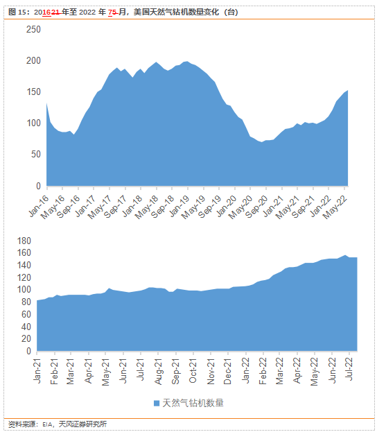 2022年1~7月,美国天然气的平均价格为6.1美元/MMBTU,与2021年同期相比,增长3.2美元/MMBTU。在高气价之下,美国天然气钻机数量有明显增长,2022年7月20日,美国天然气钻机数量为153台,与去年同期的104台相比,增速为47.1%增加了49台,相比2016年以来的历史高点(199台)要少46台**。