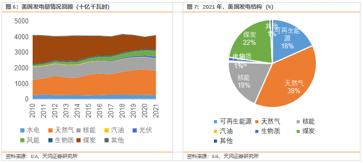 2010年,美国主要是以煤炭发电为主,煤炭发电量占全国发电总量45%、天然气发电量占24%、可再生能源发电量仅占9%。后续,随着燃煤电厂的淘汰,天然气与可再生能源地位逐渐提高,2021年,天然气发电量与可再生能源发电量占全国总发电量的38%与18%,分别为15752亿千瓦时与7547亿千瓦时,2010~2021年的年复合增速分别为4%与7%。