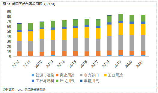 2010~2021年,美国天然气需求从66.0Bcf/d到83.0Bcf/d,年复合增速为2.1%。其中,电力、工业、居民用气与商业用途是美国天然气需求最主要的四个部分,在2021年分别占天然气总消费量的37%、27%、15%与11%。
