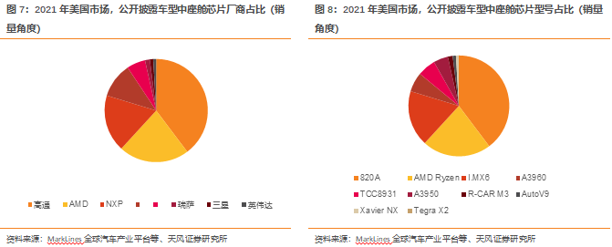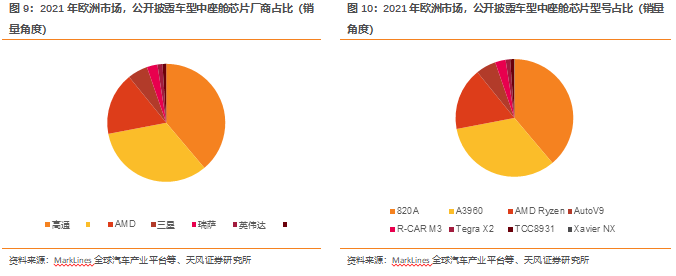 2)座舱芯片环节,筛选在欧美市场销量前20的整车厂已公布搭载智能座舱芯片的车型为样本,从销量角度计算智能座舱芯片厂商与芯片型号的市占率。样本量覆盖278.97万辆乘用车,样本具有代表性。