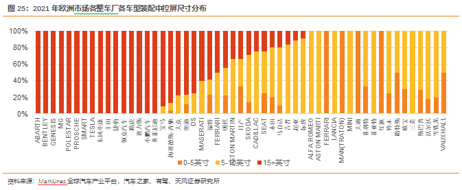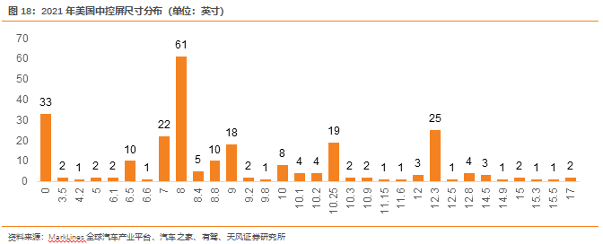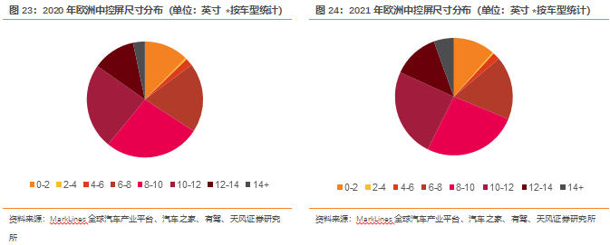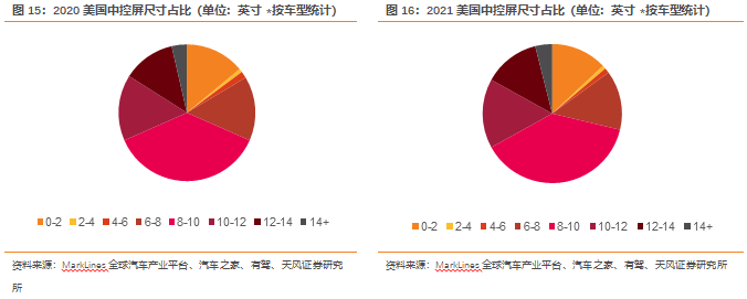 2)中国智能座舱渗透率高主要为20年后智能化提速导致。20年1-11月期间至21年,中国10英寸以上中控屏渗透率提升14.12pct,而欧美市场渗透率仅提升1.42pct。