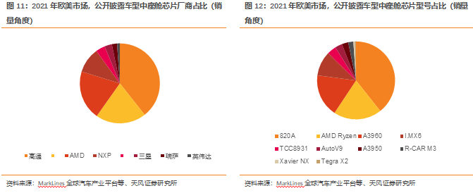 3)座舱芯片厂商中,欧美市场前三供应商为高通(39.34%)、Intel(20.46%)与AMD(19.98%)。