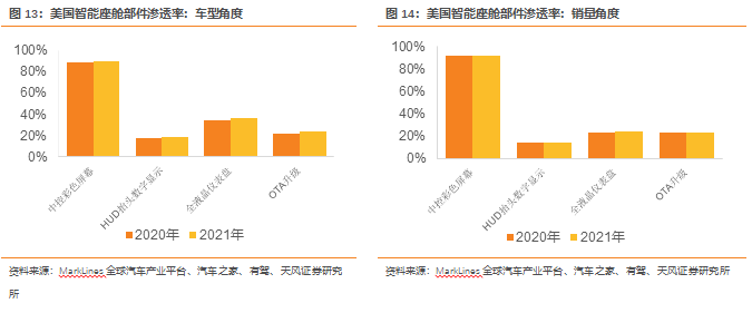 1)智能座舱渗透率环节,选取2020-2021年欧洲与美国市场所有在销车型为样本,根据其车型配置搭载情况,测算核心环节渗透率。其中,核心环节包括中控屏装配情况与尺寸、液晶显示装配情况及尺寸、HUD、OTA,纳入计算环节包括硬件与软件,整体数据具备高度代表性。