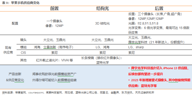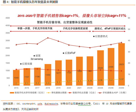 光学两大重要下游应用——消费电子和车载,从空间和格局维度剖析光学产业链投资机会:(1)智能手机:最大的硬件终端市场,2020年市场空间为1723亿元,2015至2020年CAGR为11%(高于手机整体销售额CAGR=1%),预计2025年市场空间有望达到2823亿元,2020-2025年CAGR=10%。(2)ARVR:后智能手机时代有力支撑产品,2020年虚拟现实光学市场空间为27.4亿元,预计2025年市场空间有望达到273亿元,2020-2025年CAGR=58%。(3)车载光学:智能化驱动下的车载硬件增量,2020年车载摄像头市场空间为443亿元,预计2025年市场空间有望达到1339亿元,2020-2025年CAGR=25%。(4)激光雷达:L3之后关键的光学硬件增量。多传感器冗余要求下激光雷达成为自动驾驶升级的优选硬件,2020年激光雷达光学元件市场空间为3亿元,预计2025年市场空间有望达到51亿元,2020-2025年CAGR=76%,增速为感知层硬件中最为领先。投资建议:建议重点关注光学产业链,推荐舜宇光学科技(港股)、立讯精密、闻泰科技、歌尔股份,建议关注欧菲光、联创电子、永新光学、炬光科技、凤凰光学、蓝特光学、福晶科技、宇瞳光学、力鼎光电、美迪凯、苏大维格、联合光电、中光学、福光股份、五方光电、腾景科技、丘钛科技(港股)、高伟电子(港股)、瑞声科技(港股)。核心逻辑:从上至下优选光学标的,看好绑定龙头客户落地产品厂商从终端硬件空间来看,智能手机为目前最大的消费电子存量硬件市场(2021年全球智能手机市场规模约4500亿美元),智能手机的重要零组件包括屏幕、光学、天线、中框、声学等。对比零部件成长性首推光学,量价齐升逻辑有望持续提升智能手机光学单机价值量,1) 单机配置量:前1后3→前2后5; 2) ToF、潜望式等新方案引入提升ASP。手机进入存量市场背景下,核心逻辑为重点关注供应链厂商竞争格局的变化:①苹果:重点关注21年舜宇光学科技切入苹果镜头供应商对于原先大立光+玉晶光稳定的竞争格局的冲击,我们预计舜宇光学科技后续份额有望持续提升。②安卓:重点关注光学升级趋势放缓、降规降配背景下行业格局的变化,我们认为高端厂商可能下沉参与中低端厂商的竞争,中小厂商技术+规模不占优势,产品升级和份额提升难度增加,行业集中度有望持续提升。后智能手机时代,关注能成为下一个“智能手机”的硬件,重点关注虚拟现实、车载光学和激光雷达三大硬件终端。虚拟现实、车载光学和激光雷达核心逻辑为结合技术迭代+竞争格局变动,优选绑定龙头客户落地产品的标的。光学标的积极拓展下游应用,往增速快的新兴硬件市场规模延伸虚拟现实和汽车为后智能手机时代光学的另一重要应用,新兴市场增速快+产品标准化程度高,传统领域(手机、安防)厂商积极布局切入。光学标的传统下游行业为手机、安防、光通讯、激光及投影/显微镜等,传统行业存在增长放缓、竞争加剧等限制,光学标的积极拓展下游应用领域,向新兴下游行业切换。新兴下游行业为汽车及虚拟现实。1)智能手机:最大的硬件终端市场,2020年市场空间为1723亿元,2015至2020年CAGR为11%(高于手机整体销售额CAGR=1%),预计2025年市场空间有望达到2823亿元,2020-2025年CAGR=10%。手机光学技术升级关注①7P®8P升级,玻塑混合镜头渗透率提升;②ToF、潜望式渗透率提升。手机核心逻辑为:①安卓:关注行业需求变化及竞争情况;②苹果:关注苹果创新(23年引入潜望式摄像头)+供应链格局变化(舜宇光学科技(港股)21年切入份额有望持续提升)。国内手机镜头厂商具备高端量产能力,但是低端出货占比较高,国内安卓手机品牌旗舰机型后置主摄以大立光为主,潜望式长焦镜头三星电机主供,国内厂商高端份额仍有提升空间。舜宇光学科技、瑞声科技、欧菲光具备高端量产能力,但是低端(4P、5P)占比较高,21年舜宇光学科技6P及以上出货量占比为26%,瑞声科技21Q4 6P出货量占比为12%,高端仍有较大提升空间。手机摄像头降规降配趋势下,行业竞争&价格战加剧。我们判断,智能手机降规降配+8P升级趋势放缓,定位高端的厂商(大立光等)会下沉参与中低端产品的竞争,同时具备6P、7P技术能力的镜头厂商希望通过高端突破提升产品结构,加剧行业竞争和价格战。苹果镜头:21年舜宇光学科技成功导入打破稳定格局,后续看好份额提升苹果手机镜头供应商主要有大立光、玉晶光,舜宇光学科技,21年iPhone 13中舜宇光学科技首次切入,初次切入份额不高,后续有望持续导入新料号,份额提升。新厂商进入处于格局切换阶段,看好舜宇光学科技份额提升,预计iPhone手机镜头份额大立光>舜宇光学科技>玉晶光:1)高P化推进缓慢,新供应商导入难度降低:镜头高P化推进节奏放缓(技术难度↑,终端导入意愿↓),舜宇光学科技7P量产,8P 研发成功,导入技术能力已经具备;2)21年成功切入iPhone 13实现从0到1的突破,且初次切入价值量不低,后续导入新料号难度降低;3)可能会受到大立光专利战的影响(玉晶光切入时大立光对其发动专利战)。ARVR:后智能手机时代有力支撑产品,2020年虚拟现实光学市场空间为27.4亿元,预计2025年市场空间有望达到273亿元,2020-2025年CAGR=58%。VR光学升级路线:非球面透镜®菲涅尔透镜®pancake透镜;AR处于发展初期,技术多点开花,光波导有望成为技术主流。ARVR核心逻辑为:建议关注绑定龙头客户Meta、苹果的光学供应链厂商,提前卡位有望随着产品升级持续进行技术迭代,同时后期也有望受益终端销量的放量,看好立讯精