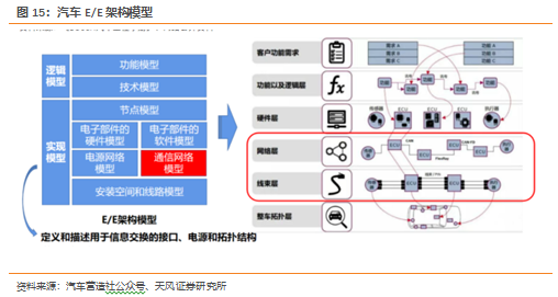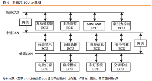 驶车型。2.1. 自动驾驶提高车载通讯需求,数据传输需求快速提升车联网对车辆的传感器数量及数据传输性能提出了更高的要求,传统车辆的对外通信需求主要是对 AM/FM 收音机信号接收、或者无网络下的定位导航天线,其传输速率要求较低,数据延时性要求不高,而在 5G 车联网框架下所衍生出的新应用场景普遍对数据的传输速率、发送频率、延时性、可靠性范围、定位精度都有较高的要求。比以驾驶员为责任主体的高级驾驶辅助技术,以机器为责任为主体的自动驾驶系统需要面对更复杂的环境和更小的容错空间。因此,自动驾驶程度的提升还将伴随着两个趋势,即冗余性传感系统的配置和各传感器之间融合程度的提升。2.2. 域集中式架构:从分散的ECU到集中的DCU汽车电子电气架构是汽车上所有电气系统的有序集合,包括了所有电气系统的线束连接和接口,数据交互,也包括了所有电气系统的运行环境,是整个汽车设计的灵魂。总线的发展是汽车电子电气架构变革的直接体现。随着ADAS的快速发展,分布式架构无已经无法适应需求。因为ADAS系统里有各种传感器,产生的大量的数据,每个传感器模块可以对数据进行预处理,为了保证数据处理的结果最优化,最好功能控制都集中在一个核心处理器里处理,这就产生了对域控制器的需求。从各主要车企和零部件供应商对未来汽车电子电气架构的规划来看,集中化已成为主流趋势。国内自主汽车目前的电子电气架构主要还是分布式的,正处于集成化和集中化演进阶段。2.3. 以太网有望成为骨干网络,全面替代其他高速总线“多拓扑并存+网关集中控制”是当前汽车总线的基本形态,总线作为一种车辆网络拓扑结构,是车上所有的电子和电气部件的互联结构的线束表现,直接影响到控制器功能分配、数据网络的规划。典型的拓扑结构有总线拓扑、环形拓扑、星型拓扑、网状拓扑以及他们之间的各种组合形式。总线的应用可以简化线束的复杂程度,主要类型有CAN、LIN(本地互连网络)、FlexRay、MOST、车载以太网等。随着车辆需要越来越多的数据来支持高级驾驶员辅助系统(ADAS)和自动驾驶,未来汽车中需要有一个通用的高带宽网络,来替代目前的部分网路。这种协议因支持较高的速率传输,又对于链路连接形式有归一性,使整车链接种类降低,成本降低,同时能将汽车轻