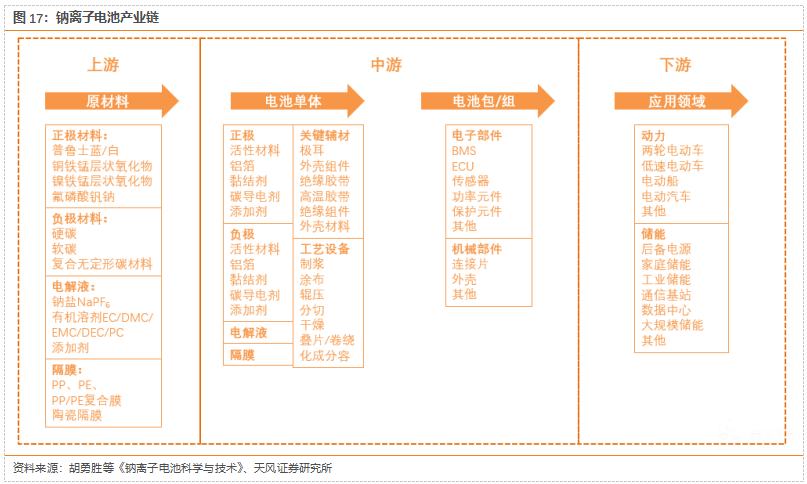 全球钠离子电池产业化的进程目前尚处于导入期;从产品参数上看,我国处于领先地位。基于钠离子电池和锂离子电池相似的工作原理、结构和生产制造工艺等,二者的成本结构也基本相同。目前钠离子电池初步应用于储能和低速动力领域,随着宁德时代第一代钠离子电池以及AB电池系统解决方案的推出,钠离子电池有望进一步拓展应用场景,从储能走向动力。与锂离子电池类似,钠离子电池产业链也主要包括上游的原材料、中游的电芯及电池以及下游的应用。与锂离子电池产业链的主要差异则表现在上游正、负极材料以及中游电池厂的技术能力。