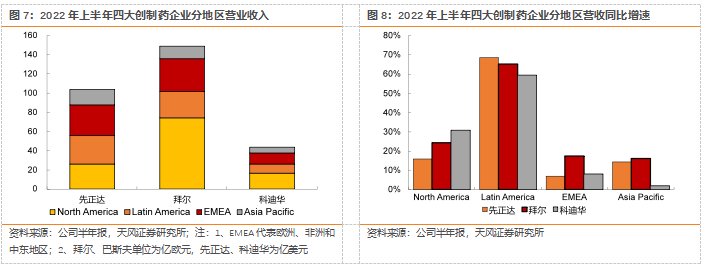 从四大创制药企业上半年的经营业绩看,公司主要受益于植保产品价格同比显著提升,销售业绩同比实现增长。展望下半年,南美种植旺季的来临以及农作物价格保持坚挺或将带来植保产品的需求增加,对企业销售产生正面影响;但同时,俄乌冲突背景下欧洲天然气的供应短缺,造成企业生产成本攀升,可能对全球农化巨头的盈利水平持续产生负面影响。