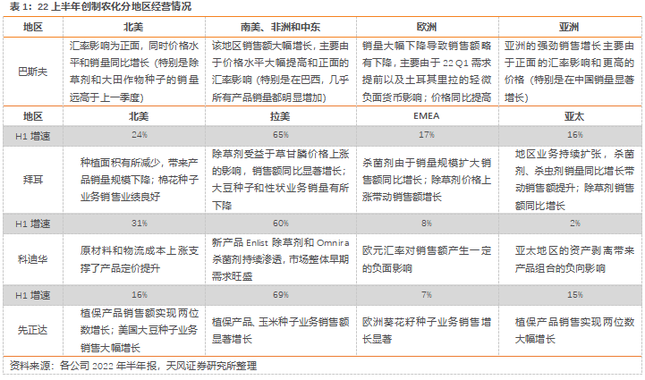 从销售区域看,上半年拉美地区是创制农化企业销售额增长的主要推动市场。先正达/拜耳/科迪华在拉美地区销售额分别实现29.71亿美元/27.75亿欧元/9.54亿美元,YOY+69%/65%/60%,销售增量主要来源于拉美地区需求强劲,叠加植保产品价格同比增长。同样受益于在产品价格增长和公司自身正面的汇率效应,除欧洲地区外,巴斯夫在其他各销售区域内均实现收入大幅增长。