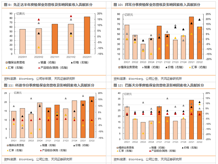 2022年上半年,四大农化企业营收同比增长的动力来源于植保产品价格同比大幅提升。21年,销售量价对四家公司的正面影响幅度呈现分化趋势,从21年Q3开始,价格持续对公司销售产生正面影响,且影响程度不断加大。单季度看,相比于22年一季度量、价对公司产生同向正面影响,Q2趋势呈现分化,其中价格对拜耳、科迪华以及巴斯夫销售的影响程度加大,但销量的影响程度环比有所回落,其中拜耳降为负向。(拜耳销量影响程度环比减少的原因主要由于北美地区种植面积减少导致销量减少)。