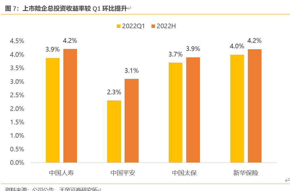 净投资收益率表现分化,人保、新华净投资收益率表现优于其他公司。2022H1国寿、平安、太保、新华、人保净投资收益率分别为4.2%、3.9%、3.9%、4.7%、4.9%,分别同比-0.2pct、+0.1pct、-0.2pct、+0.2pct、+0.1pct,整体而言,险企净投资收益率基本维持稳定。