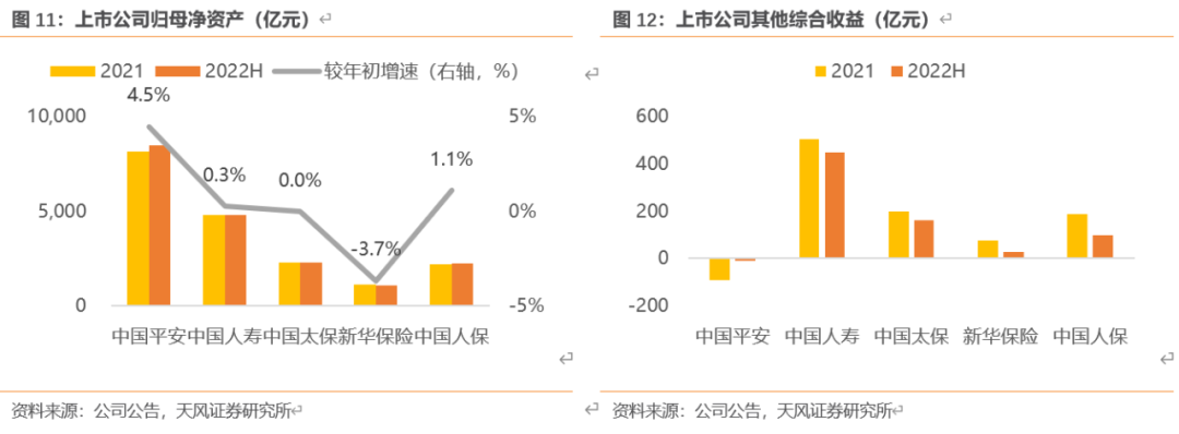 2022H1年中国平安、中国人寿、中国太保、新华保险、中国人保归母股东权益分别为8487亿元、4799亿元、2267亿元、1045亿元、2215亿,较年初增速分别为+4.5%、+0.3%、-0.0%、-3.7%、+1.1%,增速较去年同期普遍放缓,主要受净利润增速放缓以及其他综合收益减少影响。2022H1,平安、国寿、太保、新华、人保的“其他综合收益”分别从年初的-92亿、503亿、197亿、75亿、188亿变化为-10亿、448亿、159亿、27亿、99亿。