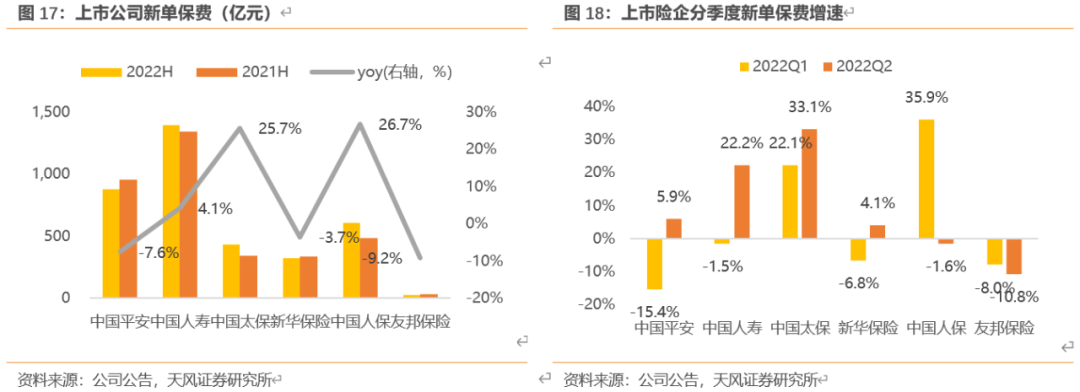 2022H1,平安、国寿、太保、新华、人保、友邦新单保费增速分别为-7.6%、+4.1%、+25.7%、-3.7%、+26.7%、-9.2%,新单表现分化,我们判断,太保、人保大幅正增长主要由公司银保渠道高增长带来。分季度看,3月后基数效应降低叠加权益市场震荡下,各家公司紧抓客户储蓄需求,大力推动以增额终身寿为主的储蓄险,驱动险企新单向上修复,Q2新单表现整体优于Q1。