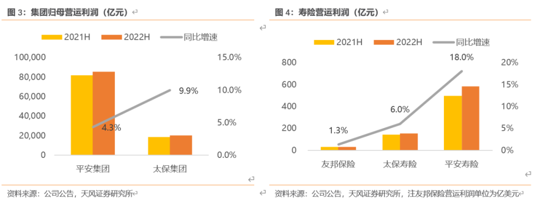 营运利润增速分化,平安寿险营运利润增速大幅领先太保寿险、友邦。平安、太保2022H1集团归母营运利润分别同比+4.3%、+9.9%,太保高增长主要由其他业务+19.6%带来。平安寿险、太保寿险、友邦营运利润分别同比+18.0%、+6.0%、+1.3%(去年同期分别为-3.2%、+6.7%、+8.5%),除平安外营运利润增速均有所放缓。1)平安寿险营运利润大幅增长,主要源于营运偏差贡献同比+70%至119亿带来;2)友邦营运利润增速下滑7.2pct主要受投资偏差大幅负贡献影响,其中有关股权及房地产投资回报的短期波动由去年同期的+2亿美元降至-18亿美元、其他非营运投资回报及其他项目由-1亿美元降至-19亿美元。