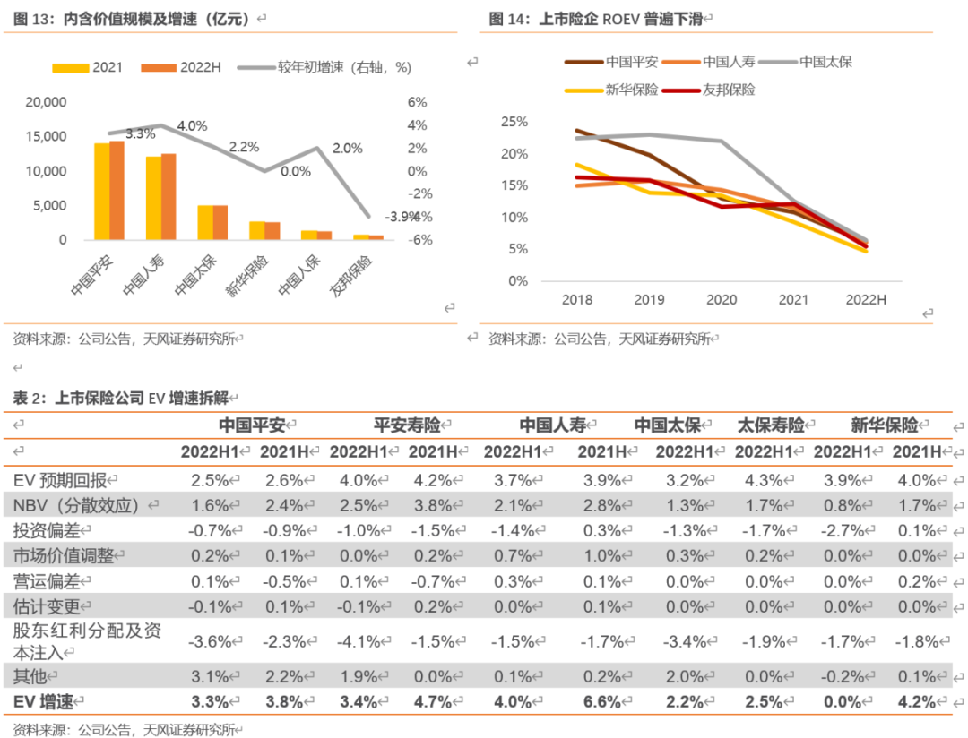 2.1. 内含价值:受NBV增速下滑与投资负偏差拖累,增速普遍放缓2022H1中国平安、平安寿险、中国人寿、中国太保、太保寿险、新华保险、中国人保、友邦保险内含价值分别较年初+3.3%、+3.4%、+4.0%、+2.2%、+2.5%、+0.0%、+2.0%、-3.9%,除友邦外均实现正增长,但增速较去年同期普遍放缓,主要源于NBV贡献减少与投资偏差负贡献。与此同时,上市险企ROEV普遍下滑,2022H1中国平安、中国人寿、中国太保、新华保险、友邦保险ROEV分别降至6.1%、6.1%、6.5%、4.7%、5.4%。