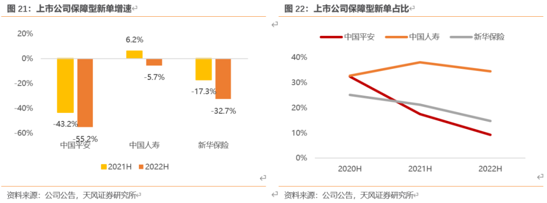 产品结构方面,上市险企长期保障型(或健康险)产品新单整体下滑,预计主要源于新旧重疾切换提前透支居民需求以及后疫情期居民收入预期下降引发的保障需求释放放缓所致。2022H1,国寿、平安、新华长期保障型(或健康险)新单同比-5.7%、-55.2%、-32.7%,占比同比-3.5pct、-8.3pct、-6.4pct。