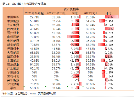 动力煤上市公司绝大多数ROE有正增长,行业平均同比增长4.7个百分点,二季度环比增长2.5个百分点。行业的资产负债率有下降趋势,2022年上半年同比下降3.21个百分点。总体而言,行业整体的财务状况均在持续向好。