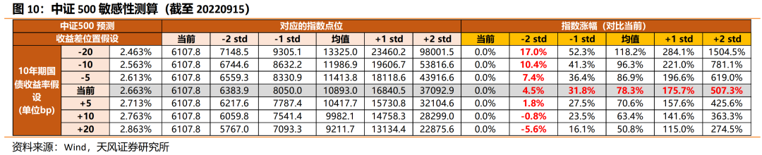 (4)综合考虑500中的成长与周期权重,我们倾向于认为当前中证500下探的概率不高。假设10Y国债收益率、中证500成分股现金分红不变:若股债收益差修复至-2X/-1X/0/+1X/+2X标准差,对应中证500涨幅为4.5%/31.8%/78.3%/175.7%/507.3%。