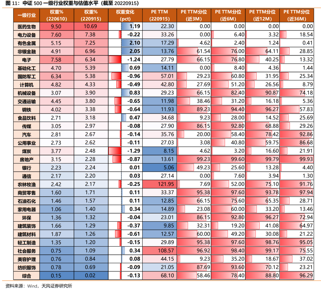 权重层面,2022年6月13日,中证500进行了100只成分股置换,调整后前五大权重板块发生变化。对比调整前权重结构和9月15日权重结构: