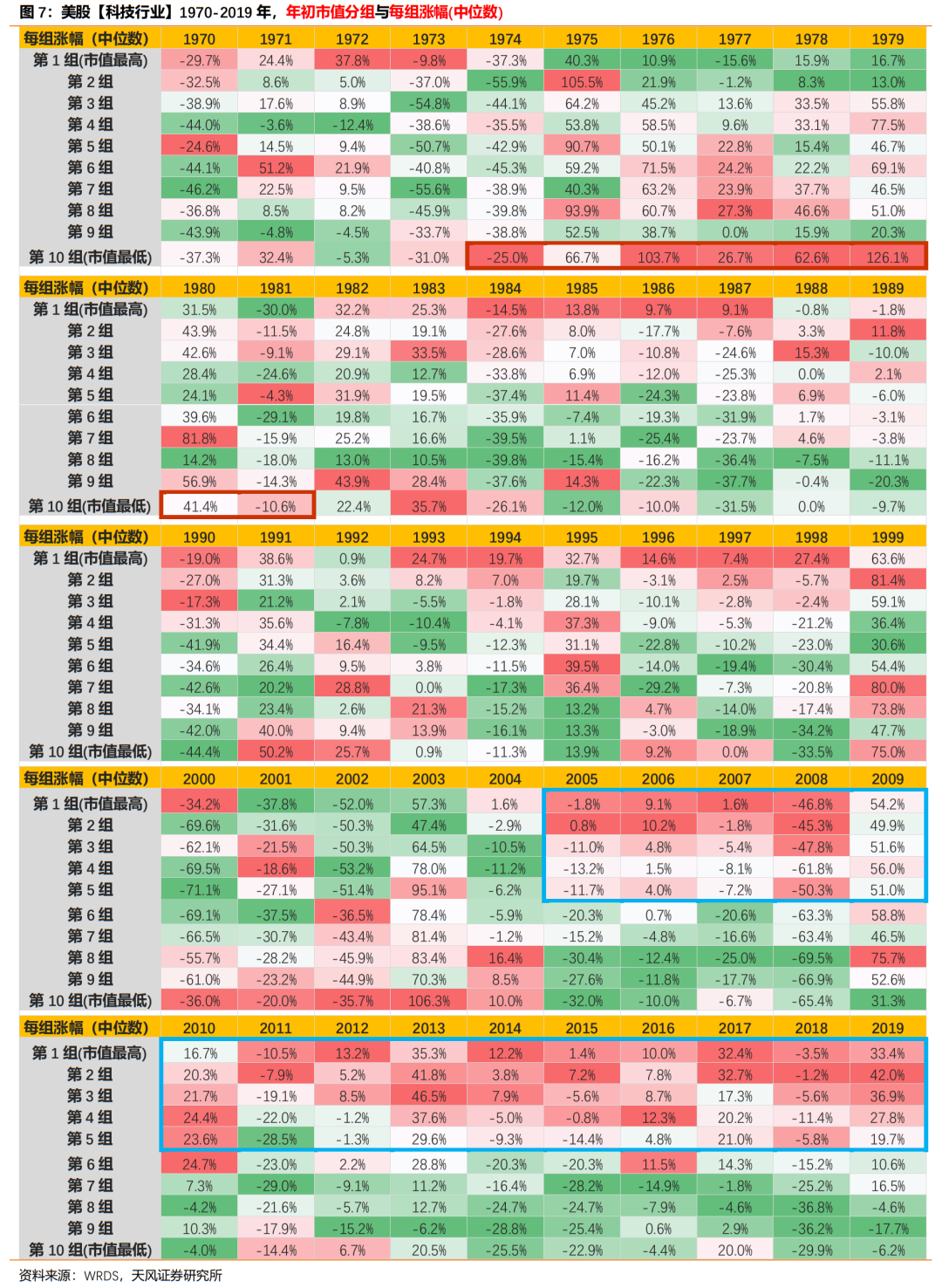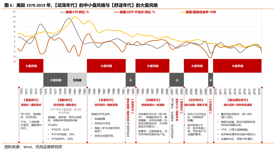 (2)极端动荡年代(持续2-5年):经济长时间停滞甚至衰退,市场往往由中小盘题材行情主导。背后多数有新兴产业催化,如70年代中后期的计算机、90年代初期的互联网。