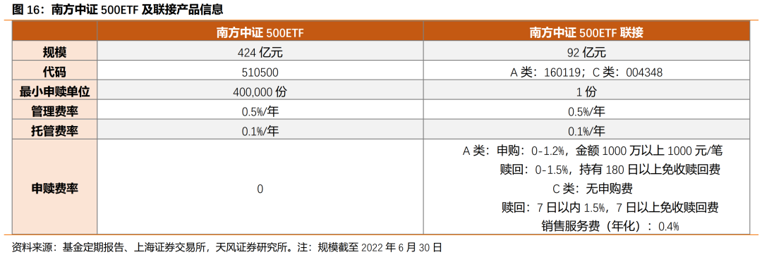 5. 南方中证500ETF(510500)以紧密追踪中证500指数为目标,为投资者提供一键布局中证500指数的投资工具,截至6月30日基金规模424亿元,流动性优势突出,同时有场外南方中证500ETF联接(A类:160119;C类:004348),建议关注。