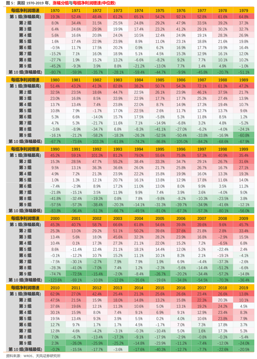从美股1970-2019年这50年来看,涨跌幅的高低与净利润增速的高低基本上也呈现线性正相关,市场对于中短期增速的偏好,不管是A股,还是港股、美股,都有相通之处。