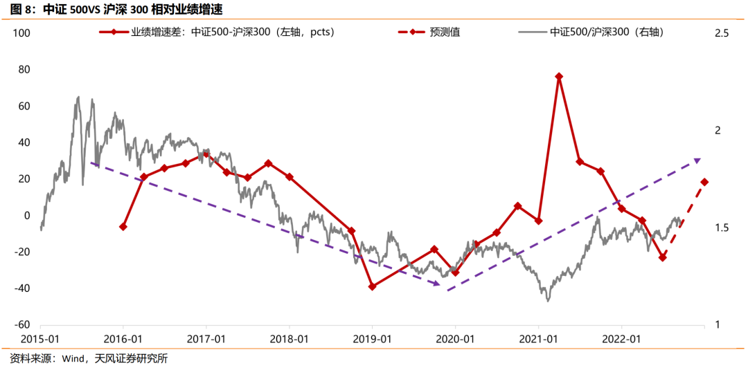 落实到微观层面,宏观因素作用于大小盘相对业绩,相对业绩趋势成为市值风格的决定性因素。通常指数或风格之间的相对强弱由相对业绩的变化决定,当中证500相比沪深300指数的大小盘盈利增速差扩大时,指数比值大概率也会往上走。目前来看,大小盘盈利增速差仍在上行趋势中,因此四季度市值风格可能仍指向中证500。