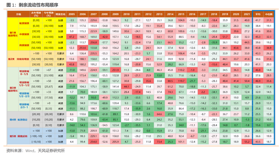 对历史数据进行回溯可以看到,更充裕的剩余流动性所追求的方向依次是【加速增长】≈【持续高增长】 ≈【减速增长-低降幅】>【困境反转】>【减速增长-高降幅】>【低速稳定】——即资金全年布局主要沿着高景气和景气反转两个方向。