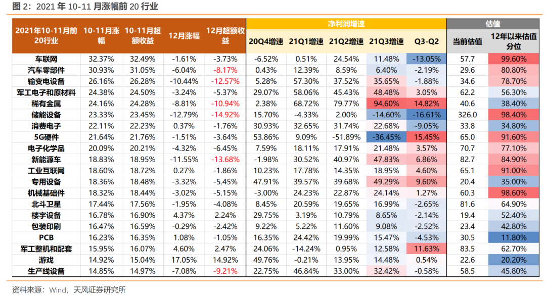 21年10-11月行情基本遵循这一规律。领涨的行业中,既有高景气赛道如【军工电子、新能源车、专用设备、消费电子】等,也有预期景气反转的【汽车零部件、5G硬件】等。此外,热门主题元宇宙、物联网等(游戏、车联网、工业互联网)也体现在年末行情中。