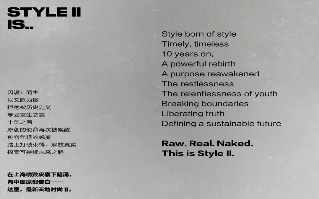 从这出发,dongqi提炼新天地时尚II的新生DNA为「Raw/Real/Naked」三大关键词,即打破束缚、解放真实、可持续未来。