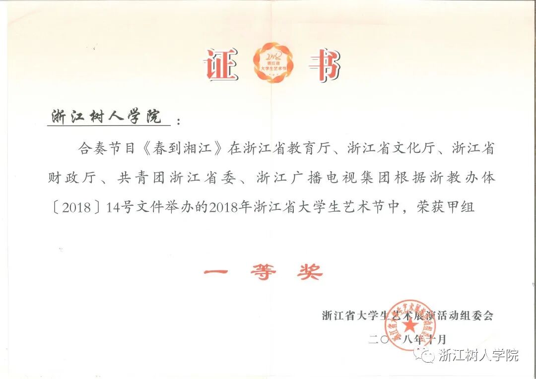 2、《春到湘江》获浙江省大学生艺术节民乐小合奏一等奖;