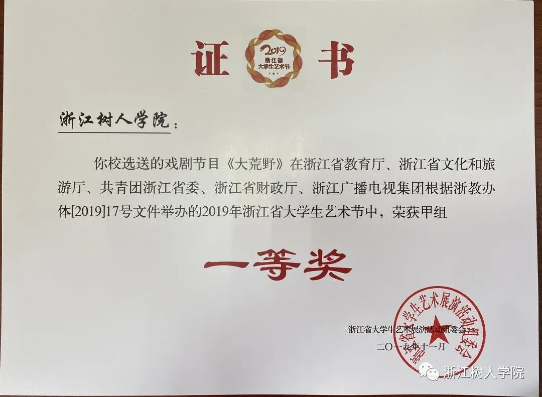 3、《大荒野》获浙江省大学生艺术节戏剧一等奖;