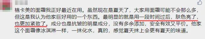 点击下图即可购买 👇如果是新读者,可以耐心看完我下面的介绍,我相信你会感谢我的推荐的!从我本人使用几个月的感受来看,它突出的优点有三个:大概使用三周后,我就明显感觉自己的脸蛋比以前紧致了不少,而且肤色提亮了很多。脸蛋摸上去细腻光滑,感觉像从未粗糙过。从事过新媒体行业的人应该了解,这个职业熬夜多,压力大,所以普遍存在肌肤初老问题。具体表现就是肌肤处在不稳定的状态,随便一加班、吃辣的,皮肤就会出现各种状况。正因如此,我一向对同学聚会、拍合照什么的特别敏感。坚持使用抗老面霜一个月出头后,我感觉自己的皮肤状态慢慢稳定了很多。通俗点说,就是皮肤更“耐造”了,不会稍微一熬夜、压力大就造反。我自己基本上每天早上出门抹一次,到晚上回来脸上都很润.植卡美面霜抹开后皮肤很清爽,吸收很好,完全没有普通面霜油腻腻的感觉。晚上睡觉前,我甚至会把它当睡眠面膜使用,薄薄涂一层,整个晚上皮肤都非常滋润清爽,第二天起来肌肤水润饱满得简直自己都想亲一口。从我前后使用过几十款面霜的经验来看,植卡美的这款抗老面霜真的超能打。可以说在100-200价位没有对手,甚至可以比肩很多四五百元的面霜。之所以能做到这一点,是因为这是一款从内到外都充满黑科技和诚意的产品。而在抗老面霜这种产品上,一直以来效果最好的成分之一就是胜肽2。自发现至今,它在紧致肌肤、重建肌肤健康生态方面的效果,已经被无数科研论文证明:正因如此,我们会看到:无数大牌护肤品牌的抗老产品线,都会将胜肽作为自家产品的核心成分:比如某诗某黛的胶原霜,*蔻的小黑瓶,例子还有很多就不一一列举了。而植卡美抗老面霜,就是基于某诗某黛的成分配方思路,再搭配上自家科技创新开发出的一款品质面霜。和大牌一样,它的核心成分也是胜肽,而且添加量非常丰富良心。不同的是,它的价格连大牌的五分之一都不到,是真正的良心国货。植卡美对比了过百种胜肽的护肤效果,优选了焕颜肽3作为核心成分。在胜肽作为核心成分的基础上,植卡美面霜进行了科学地复配。研发团队测试对比了几百种配方,最终的效果确实好到爆炸。产品上市之前,品牌方做了 6 轮内部测试,超过数百名志愿者参加,下面是测试的对比图:产品上市之后,很多用户使用后也是给出了满满的好评。废话不多说,继续上前后对比图:不仅如此,还有第三方测评机构,对抗皱、紧致、舒缓三方面功效做了专业的评测,结果均为功效显著:恰好品牌方做活动,给出了非常大的活动力度,是入手面霜的好时机,个人觉得不买真的亏大了,墙裂推荐立即入手:Ⅱ、先使用赠送的样品,正装不拆支持30天内全额退款。