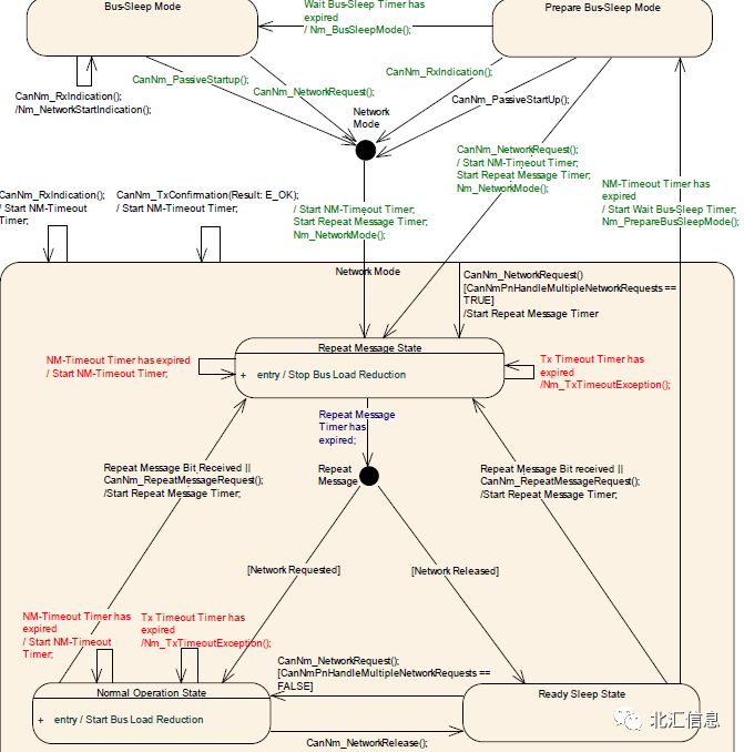 ECU通过接收和发送NM PDU来传递网络管理的信息,而这些信息也决定ECU所处的状态。以CAN通信为例,NM模块包含NM的状态机,针对ECU的通信端口,表示端口所处的网络管理状态,简单来说为网络的请求和释放。