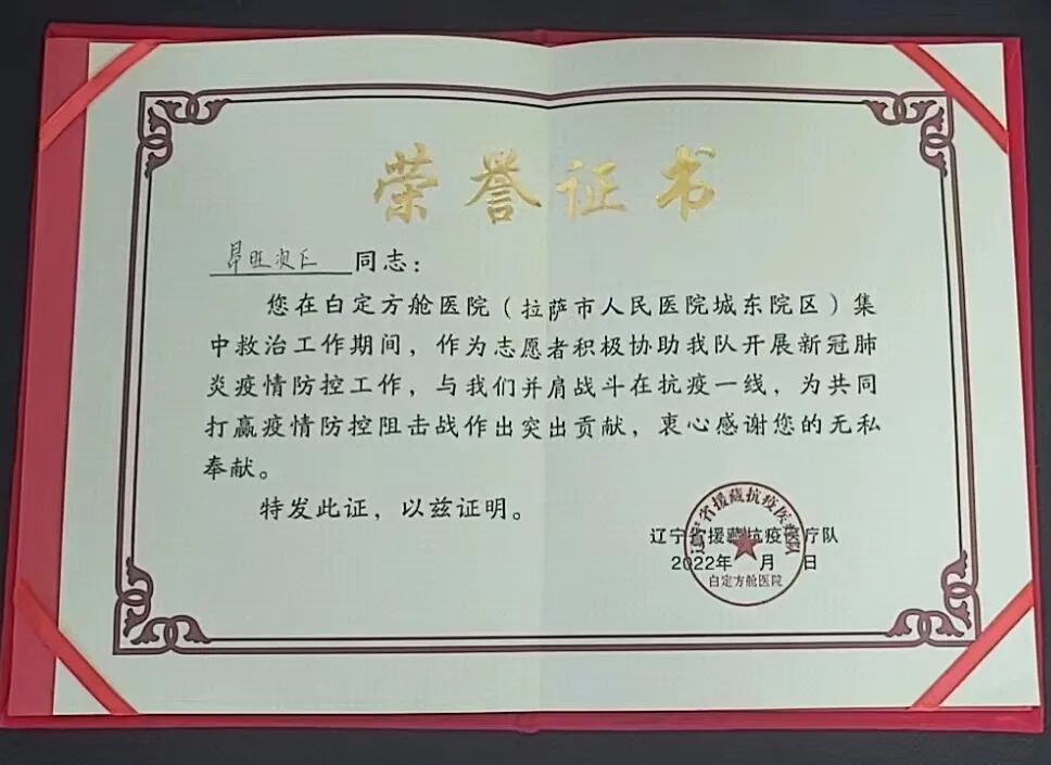 9月23日,医护人员将一个荣誉证书,送到昂旺次仁手中,以此对他表示感谢和鼓励。