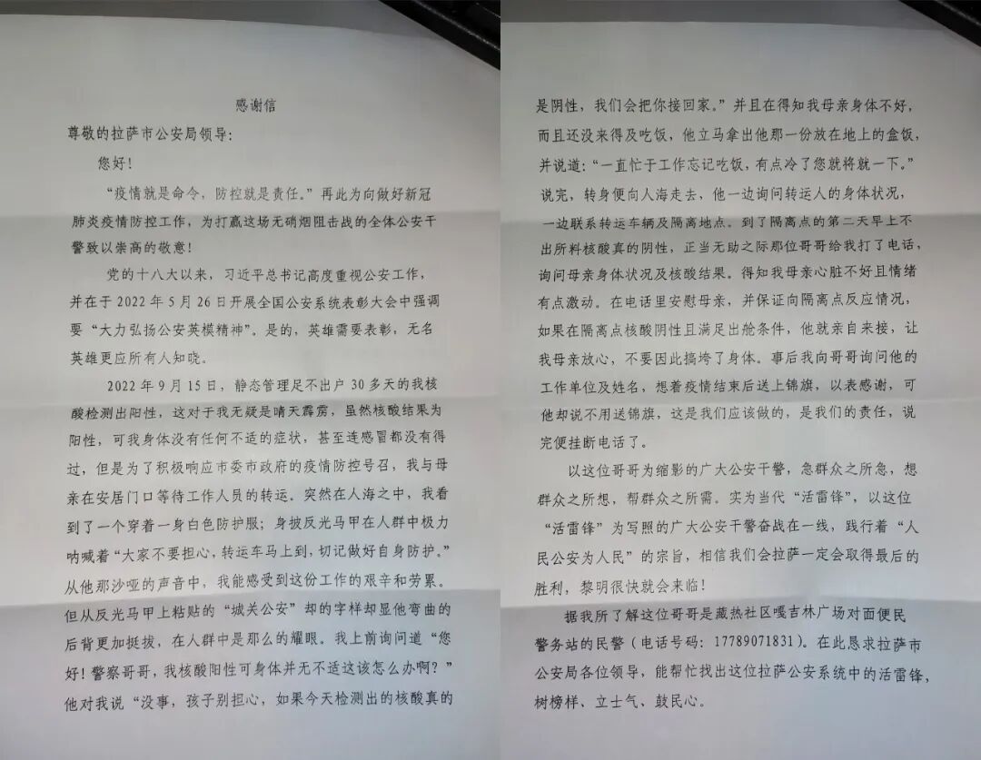 近日,拉萨公安抗击疫情的一线民辅警们又收到了五封感谢信,字里行间,饱含浓浓感激之情。