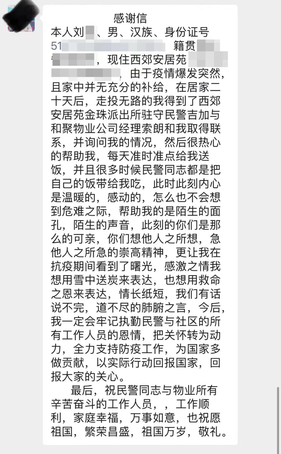 信中写道:“我怎么也不会想到危难之际,帮助我的是陌生的面孔,陌生的身影,此刻的你们是那么的可亲,你们想他人之所想,急他人之所急的崇高精神,更让我在抗疫期间看到了曙光。”
