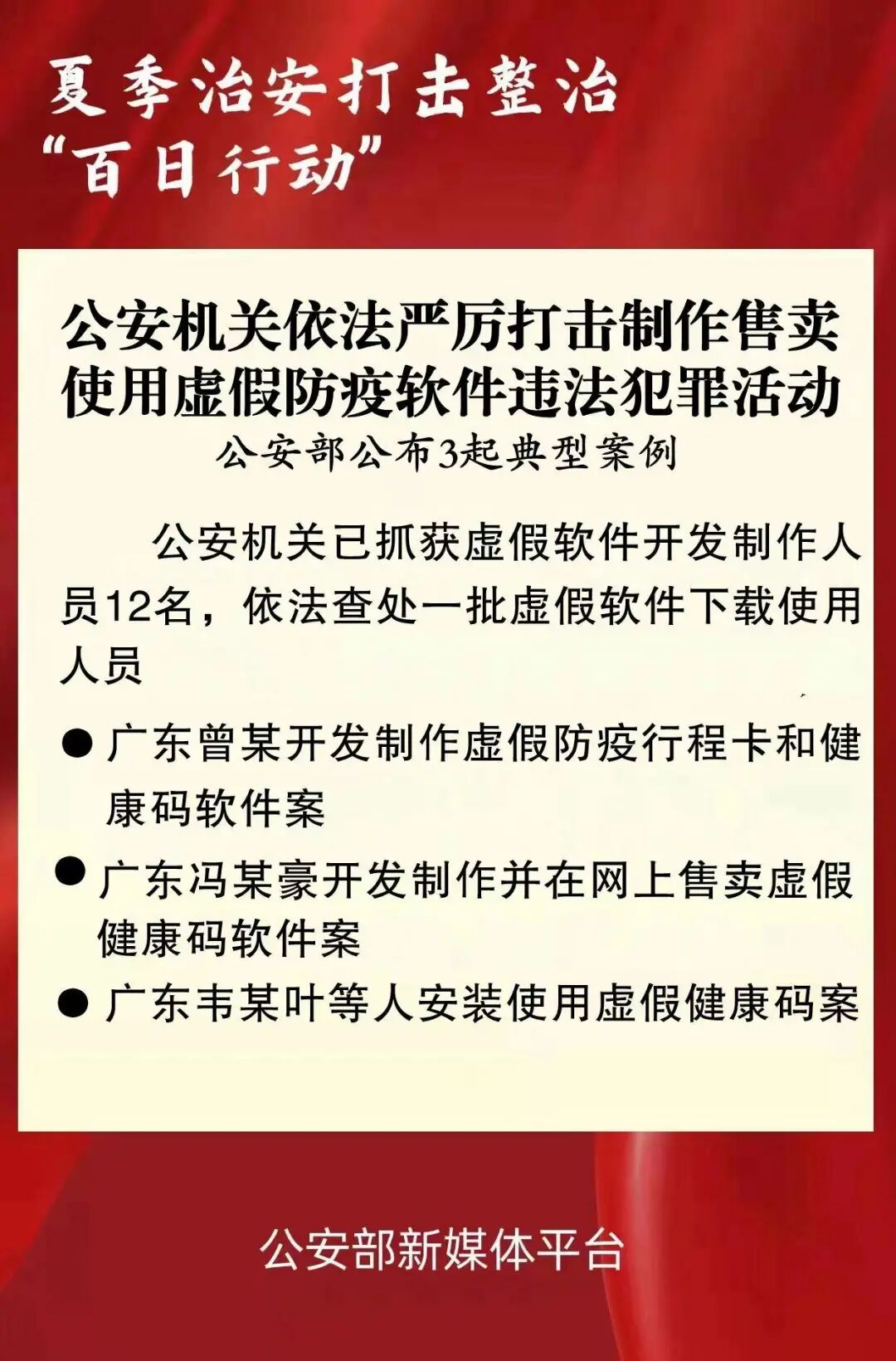 近日,在全国公安机关夏季治安打击整治“百日行动”中,公安网安部门果断出击、迅速侦破一批开发制作、发布售卖、下载使用虚假防疫软件案件,及时消除相关涉疫风险隐患。公安部今日公布3起典型案例。针对近期网上涉疫违法犯罪活动情况,公安部网安局高度重视,部署广东等地公安机关依法深入开展侦查,发现个别违法犯罪嫌疑人在互联网上开发制作、发布售卖虚假防疫“大数据行程卡”和“健康码”等软件,帮助他人伪造涉疫证明信息,并在山寨仿冒的健康码页面进行显示,以此蒙骗防疫工作人员查验,严重干扰疫情防控秩序。目前,公安机关已抓获虚假软件开发制作人员12名,依法查处一批虚假软件下载使用人员。公安部网安局有关负责人表示,公安机关将深入推进夏季治安打击整治“百日行动”,始终保持对各类网上涉疫违法犯罪活动的严打高压态势,坚决维护疫情防控秩序和人民群众生命健康。公安机关提示,开发制作、发布售卖、下载使用虚假涉疫软件,不仅严重干扰破坏疫情防控正常秩序,而且涉嫌违法犯罪,请广大群众提高防范意识自觉抵制违法犯罪行为,共同维护疫情防控秩序。公安机关依法严厉打击开发制作、发布售卖、下载使用虚假防疫软件违法犯罪典型案例: