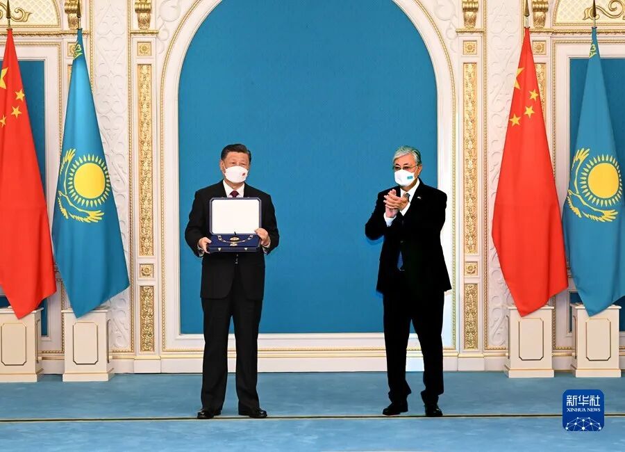大理石厅金碧辉煌,中哈两国国旗整齐排列,气氛庄重热烈。托卡耶夫致授勋辞。托卡耶夫表示,今天,伟大的中国国家主席习近平访问哈萨克斯坦,是哈方的莫大荣幸。习近平主席是一位真正的伟大领袖,得到中国人民的衷心拥护。在习近平主席卓越领导下,中国取得伟大发展成就,消除了绝对贫困,全面建成了小康社会,中华民族伟大复兴进入新征程。相信在习近平主席英明领导下,中国必将如期实现全面建设社会主义现代化国家的宏伟目标。习近平主席提出共建“一带一路”和构建人类命运共同体的伟大倡议,为推动建设新型国际关系作出杰出贡献。习近平主席提出的全球发展倡议和全球安全倡议,对于解决当今世界面临的风险挑战具有重要战略意义。托卡耶夫高度赞赏习近平主席为巩固两国人民友谊和推动哈中关系发展发挥的历史性作用和作出的巨大贡献,表示习近平主席今天的访问必将载入哈中关系史册。哈方愿同中方一道努力,促进两国共同繁荣发展,增进两国人民福祉,携手迈向更加美好的未来。![]()