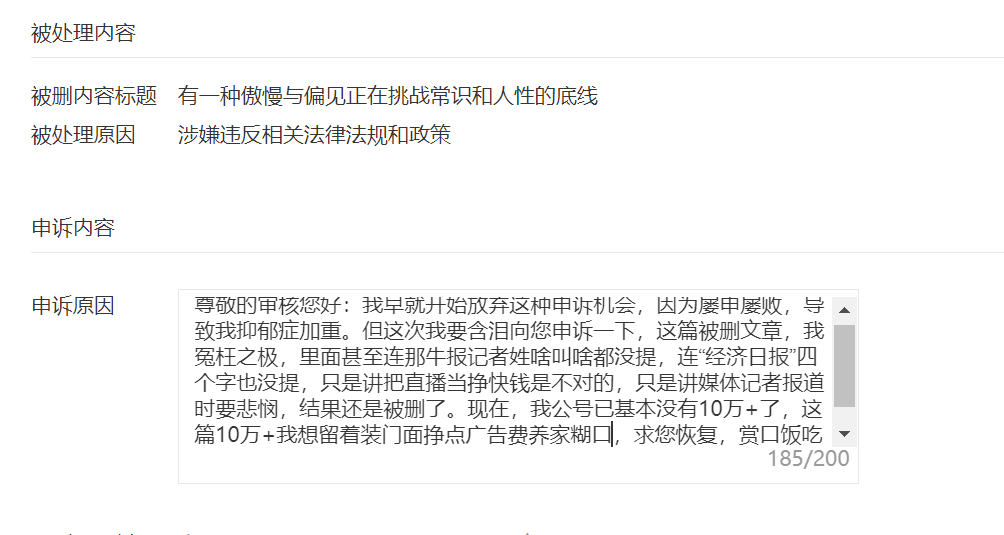稿件因举报被灭后,平台往往会给申诉机会。虽然我申诉基本不成功,但每次我都珍惜与后台审核者对话机会。