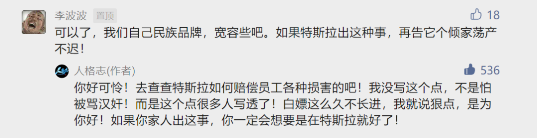 我这篇批评比亚迪对待猝死员工太冷血的文章,与之前所有为底层呼喊的文章一样,发出来之后,后台立即冒出很多粗暴脏骂和恶毒诅咒。比起那些恶骂,我置顶的这条留言是温和的。但是,对我的伤害性,要远比那些恶骂大得多。对我来说,前者属于弱智低贱垃圾人格,我看一眼兴趣都没有,自然也就没有半点伤害。但,李波波完全不同了。对他,我不是完全鄙视,更多还是悲哀。大家不妨再看看他留言的关键词——民族品牌、特斯拉、告它!很显然,李波波了解一些的知识信息,有一些法律意识。但是,这些知识和意识,在对“民族品牌”的盲目热爱与对“特斯拉”代表美帝虚妄仇恨的对比放大下,让李波波对被资本残忍对待的同胞生命,格外冷漠。昨天,我不顾一个写手的自我修养,对留言这样狠狠回复:只要查查特斯拉对待工伤等方面的福利和赔偿,就会知道什么才是真正“没有对比就没有伤害。”在这方面拿比亚迪跟特斯拉,脸肯定是要被打肿的。不要以为李波波只是掉进民粹主义的思维陷阱,对“民族品牌”盲目偏爱走火入魔。这种人绝不是真爱“民族品牌”,他就与某文某平之类打着“爱国主义”旗号收割韭菜一样,只是相关制度政策规则的既得利益者罢了。那就是一大批像李波波这样的既得利益者,正在从“精致利己主义者”转化为“制度性合法伤害实施者”。这个叫“谢竹峰”的人,不仅属于鲁迅先生笔下那种“终于做稳了奴隶的人”,在老将看来,他已变成“奴隶制度的坚决捍卫者”。针对比亚迪员工猝死前每天上班12小时,谢竹峰为自己“现在每天工作时间基本上不低于13个小时”欣然自赏。谢竹峰还一脸正义地认为,我是“心里有问题的人,应该去看心里医生了”。连续两次将“心理”写成“心里”,谢竹峰文化想必是不高的。换句话说,谢竹峰已属于“叫不醒”的人了。那个李波波如果刹不住,就会变成第二谢竹峰。他们不但不会悲悯同情同胞,反而会对帮助他解开制度捆绑的人,磨刀霍霍。在他们心中,20万赔偿“可以了”,月薪7千(其实没有)加班13小时“感恩了”。这样的既得利益和精致利己,正在从人性冷漠者变成合法残害者。今天我要感恩的是,在昨天那篇《比亚迪赔偿猝死者20万格局太小:卢克文的BYD价值观》文章下面,大量朋友的留言,让我看到思维觉醒和人格提升的力量。