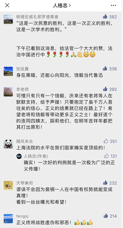 老将的朋友们值得致敬!我放出你们的大量留言证明,共同为上海的法治文明点赞,为让饶毅免罪的法官专业点赞。