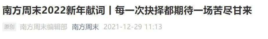 今天又见新年献词。在种写作上,南方周末从来都是被模仿,永远也没被超越。包括他们自己。倒也不是再无人能写出那样的文本观点了,关键是,时代变了,人心也变了。今年,那个心性温厚的兄弟写下的2022新年献词,在我心中依然还是有光的: