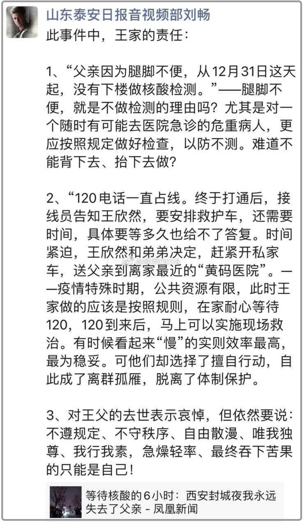 认为网友发声是“揪住一点,抹杀全部”,认为民意“偏执如此”。这种言论,表明他一面毫无人性悲悯地对待生命流逝,一面对准批评者进行扣帽子举棍子,凶猛追击痛杀。要知道,连西安卫健委主任都为此事进行公开道歉了,相关责任人也都受到应有的问责处罚了。但是,刘畅却仍在助纣为虐,仍在恶上加恶,仍在混淆是非,仍在颠倒黑白。这样的恶,就足以引起警醒了!而在此事上勇敢发声的科学家颜宁被杀退微博,也正是拜这类蛆头所赐。值得强调的是,这个记者如此主动施恶,根本就不一次孤例,而是体系性系统性的持续行为。他不仅毫无人性伦理冰冷对待民众,而且还极度无耻地为王丽这样的恶权进行脱罪加冕。