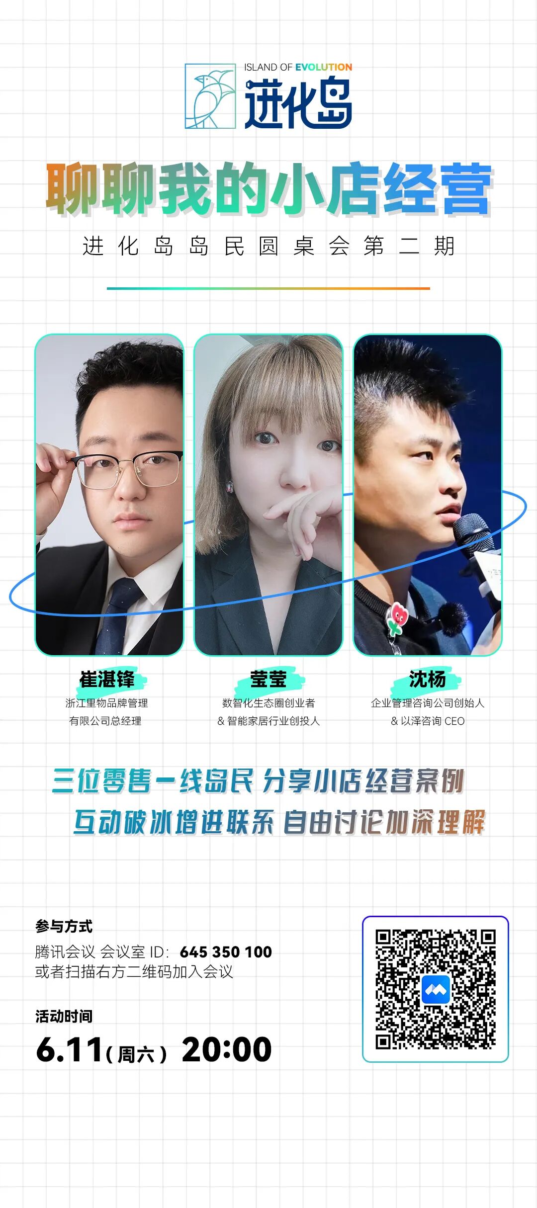 PS 本周六(6月11日)晚8点第二期进化岛岛民圆桌会,我们将一起探讨实体店经营,欢迎大家参加。