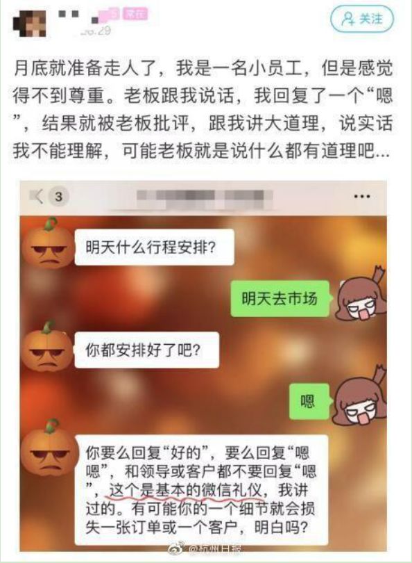 像上面员工回复老板的案例,员工如果用‘嗯嗯,好的’就显得十分得体了!
