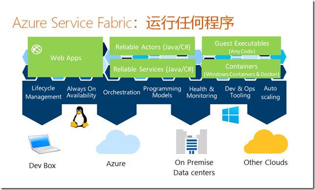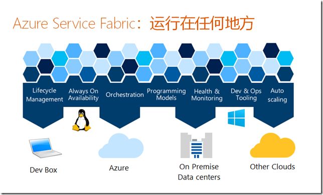 上图说明了,Service Fabric Native是跨平台且不绑定任何公有云平台的。并说明了一些内置的强大能力。
